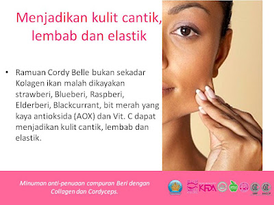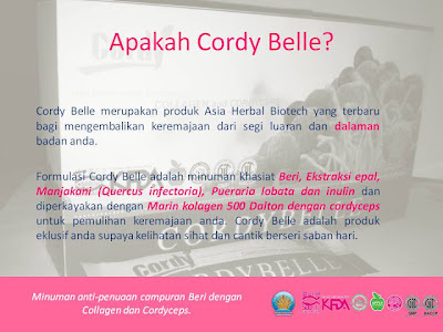 Cordy Belle merupakan produk Asia Herbal Biotech yang terbaru bagi mengembalikan keremajaan dari segi luar and dalaman badan anda. Minuman khasiat Cordy Belle adalah daripada formulasi beri, ekstraksi epal, Manjakani (Quercus infectoria), Pueraria lobata dan inulin dan diperkayakan dengan Marin kolagen 500 Dalton dengan cordyceps untuk pemulihan keremajaan anda. Cordy Belle adalah produk eklusif anda supaya kelihatan sihat dan cantik berseri saban hari.